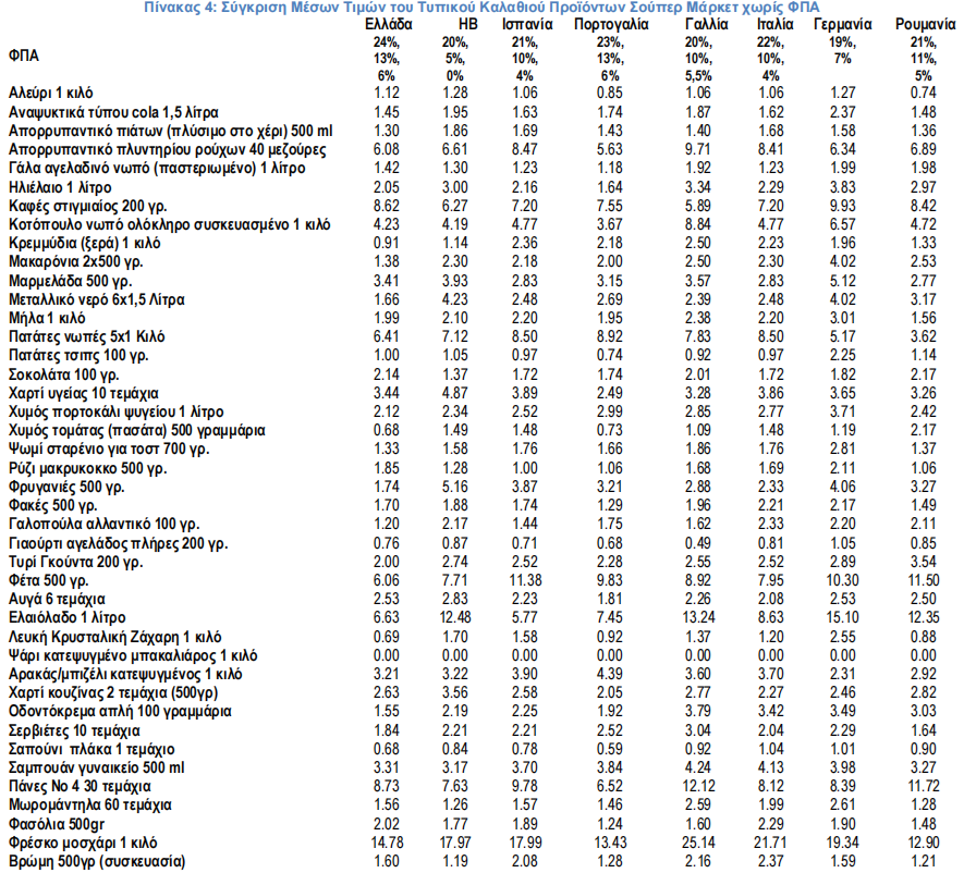 Η εικόνα των αποτελεσμάτων αλλάζει σημαντικά όταν αφαιρέσουμε τον αναλογούντα ΦΠΑ ανά χώρα για να γίνουν αντιληπτές οι πραγματικές τιμές των προϊόντων σουπερμάρκετ. Η σύγκριση των καλαθιών σε αυτή την περίπτωση (σχήμα 1 και πίνακας 1) δείχνει ότι οι και οι επτά χώρες έχουν πιο ακριβό μέσο καλάθι από την Ελλάδα, η Γερμανία κατά 39%, η Γαλλία κατά 38%, το Ηνωμένο Βασίλειο κατά 22%, η Ιταλία κατά 22%, η Ισπανία κατά 18% η Πορτογαλία κατά 4% και η Ρουμανία κατά 17%. Αυτό είναι αποτέλεσμα της διαφοράς που έχει ο χαμηλός ΦΠΑ ανά χώρα (πρόκειται για τον ΦΠΑ που αναφέρεται σε τρόφιμα και ποτά). Στην Ελλάδα αυτός ο ΦΠΑ είναι 13%. Ο ΦΠΑ είναι σημαντικά υψηλότερος από το Ηνωμένο Βασίλειο (0% ή 5%) και τη Γαλλία (10% και 5,5%), την Ισπανία (10% και 4%), την Πορτογαλία (13% και 6%), την Ιταλία (10% και 4%), την Γερμανία (7%) και την Ρουμανία (11% και 5%), αλλά και τις περισσότερες χώρες της ΕΕ. Η βασική διαφορά είναι ότι τρόφιμα που στην Ελλάδα υπάγονται ακόμα και στον μεσαίο συντελεστή ΦΠΑ με 13% στις υπόλοιπες χώρες υπάγονται στον χαμηλό συντελεστή ΦΠΑ, ο οποίος είναι και χαμηλότερος του ελληνικού με 6%, 5,5%, 4% ή ακόμα και 0%. Ελάχιστα προϊόντα βρίσκονται στον χαμηλό ΦΠΑ στην Ελλάδα και στον υψηλό στις άλλες χώρες (π.χ. μωρομάντηλα) Σημειώνεται ότι η επίδραση ειδικών φόρων κατανάλωσης (π.χ. καφές) δεν είναι δυνατόν να συνυπολογιστεί στα παραπάνω στοιχεία.
