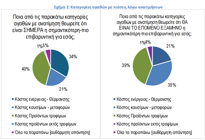 Όπως φαίνεται στο σχήμα 2, ως προς τις κατηγορίες προϊόντων με τη μεγαλύτερη επιβάρυνση, οι καταναλωτές εκτιμούν ότι η μεγαλύτερη επιβάρυνση σήμερα είναι από τις τιμές καυσίμων-ενέργειας (αθροιστικά) και τις τιμές τροφίμων.