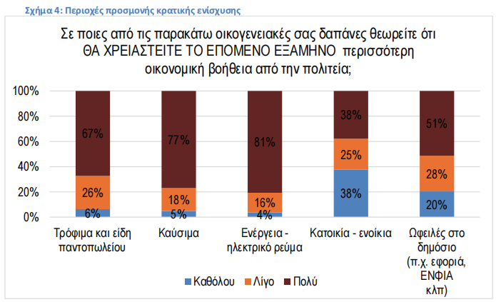 Τέλος, στο σχήμα 4 καταγράφεται έναν καταναλωτικό κοινό με έντονη προσμονή για κρατική ενίσχυση, με τα δεδομένα αναδεικνύουν ότι η ενεργειακή επιβάρυνση εξακολουθεί να αποτελεί το σημαντικότερο πεδίο ανάγκης παρέμβασης. Συγκεκριμένα. σε ό,τι αφορά τις ανάγκες οικονομικής ενίσχυσης για το επόμενο εξάμηνο: