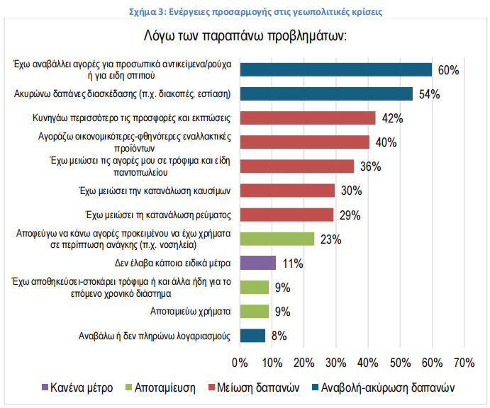 Όπως καταγράφεται στο σχήμα 3, οι καταναλωτές προχωρούν σε άμεσες προσαρμογές της καθημερινής τους συμπεριφοράς με κύριες κατευθύνσεις την αναβολή δαπανών και την μείωση δαπανών. Συγκεκριμένα για την αναβολή δαπανών: